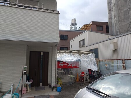 で、昼間は適当な町中華を考えていたのですが、そこにたどり着くまでまだ結構かかりそうだけど腹は減った、という状況になってしまい、急遽適当にGoogleMapで周辺を調べたら、なんか住宅街の中にポツンとラーメン屋を見つけました。土日の昼しかやってない…。胡散臭いけど面白そうなので行ってみると…。普通の戸建て一軒家の庭とガレージを潰して簡易ハウスで営業してる~。客は外(テントや防風シートはあるけど)で食べる感じ~。面白い。